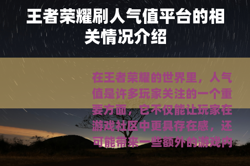 王者荣耀刷人气值平台的存在是一个复杂的现象,它既反映了玩家对于人气值的重视和追求,也凸显了游戏生态中存在的一些问题,只有通过玩家和游戏开发商的共同努力,才能营造一个更加公平、健康、有序的游戏环境,让王者荣耀这款游戏能够持续地发展和繁荣下去。 对您有所帮助,您可以根据实际需求进行调整和修改,如果您还有其他问题,欢迎继续向我提问。