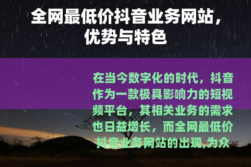 在当今数字化的时代,抖音作为一款极具影响力的短视频平台,其相关业务的需求也日益增长,而全网最低价抖音业务网站的出现,为众多用户提供了极具性价比的选择。