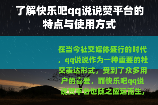 在当今社交媒体盛行的时代,qq说说作为一种重要的社交表达形式,受到了众多用户的喜爱,而快乐吧qq说说赞平台也随之应运而生,为用户提供了一种独特的互动体验。