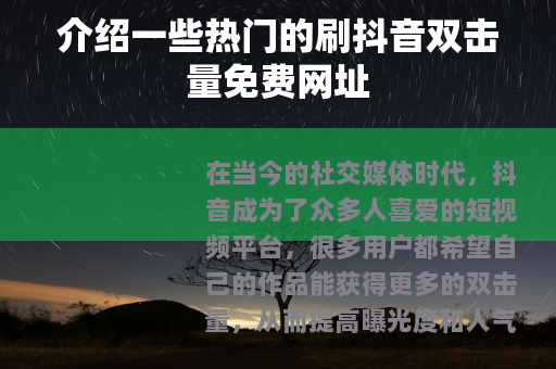 在当今的社交媒体时代,抖音成为了众多人喜爱的短视频平台,很多用户都希望自己的作品能获得更多的双击量,从而提高曝光度和人气,网络上出现了一些声称可以提供刷抖音双击量免费网址的信息。