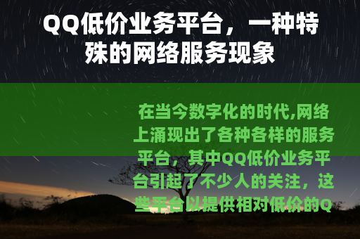 QQ低价业务平台作为网络服务领域的一种特殊现象,既有其存在的合理性和积极意义,也面临着一些挑战和问题,在未来的发展中,这些平台需要不断优化自身的运营模式和服务质量,加强市场竞争能力和用户信任度建设,以实现可持续发展,用户在选择使用这些平台时,也应该保持理性和谨慎,充分了解平台的相关信息,确保自身的权益得到保障,QQ低价业务平台才能在网络服务市场中找到自己的发展空间,为用户提供更加优质、便捷、实惠的服务。