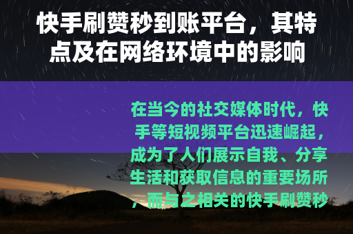 在当今的社交媒体时代,快手等短视频平台迅速崛起,成为了人们展示自我、分享生活和获取信息的重要场所,而与之相关的快手刷赞秒到账平台也应运而生,在网络世界中引起了一定的关注。