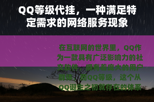 在互联网的世界里,QQ作为一款具有广泛影响力的社交软件,拥有着庞大的用户群体,而QQ等级,这个从QQ诞生之初就存在的体系,对于许多用户来说,有着特殊的意义,QQ等级代挂服务也随之应运而生,成为了网络上的一种独特现象。