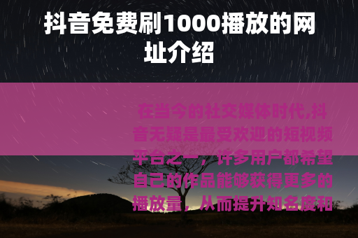 在当今的社交媒体时代,抖音无疑是最受欢迎的短视频平台之一,许多用户都希望自己的作品能够获得更多的播放量,从而提升知名度和影响力,而关于抖音免费刷1000播放的网址也成为了一些用户关注的话题。