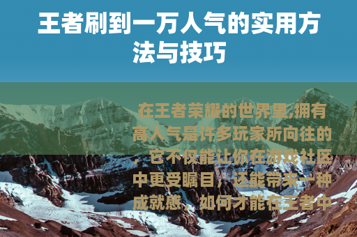 在王者荣耀的世界里,拥有高人气是许多玩家所向往的,它不仅能让你在游戏社区中更受瞩目,还能带来一种成就感,如何才能在王者中刷到一万人气呢?以下是一些可行的方法和技巧。