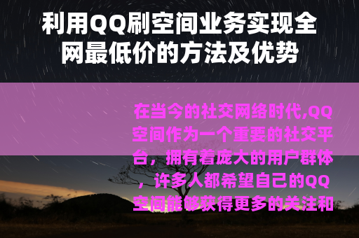 在当今的社交网络时代,QQ空间作为一个重要的社交平台,拥有着庞大的用户群体,许多人都希望自己的QQ空间能够获得更多的关注和人气,而全网最低价的QQ刷空间业务便应运而生,为用户提供了一种高效且经济实惠的方式来提升自己空间的热度。