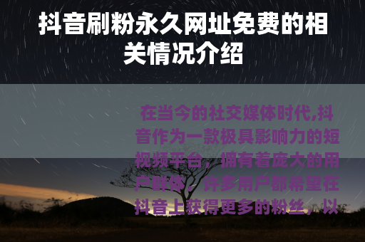 在当今的社交媒体时代,抖音作为一款极具影响力的短视频平台,拥有着庞大的用户群体,许多用户都希望在抖音上获得更多的粉丝,以增加自己的影响力和作品的传播度,抖音刷粉永久网址免费这样的信息便在一些网络角落中出现了。