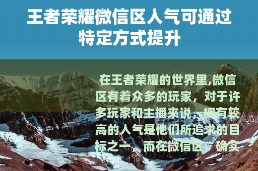 在王者荣耀的世界里,微信区有着众多的玩家,对于许多玩家和主播来说,拥有较高的人气是他们所追求的目标之一,而在微信区,确实存在着一些方法可以帮助提升人气。