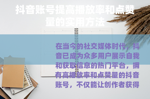 在当今的社交媒体时代,抖音已成为众多用户展示自我和获取信息的热门平台,拥有高播放率和点赞量的抖音账号,不仅能让创作者获得更多的关注和认可,还可能带来各种商业机会,抖音账号怎样提高播放率和点赞量呢?以下是一些实用的方法。 质量是关键,要确保你的视频内容具有独特性、趣味性和实用性,独特的视角、新颖的创意能够吸引用户的注意力,让他们在众多视频中选择观看你的作品,你可以分享一些别人不知道的生活小窍门、独特的旅行经历或者有趣的才艺表演,趣味性也非常重要,能够让用户在观看视频的过程中产生愉悦的心情,从而更愿意点赞和分享,实用性则体现在能够为用户提供有价值的信息,比如专业知识讲解、美食制作教程等,满足用户的学习需求。