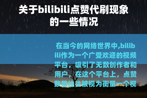 bilibili点赞代刷是一个在平台发展过程中出现的现象,它既有一定的市场需求,但也带来了诸多问题,我们需要正确认识它,并通过各方的共同努力,让平台的发展更加健康和可持续。