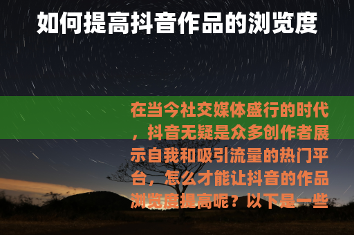 通过以上这些方法的综合运用,不断优化和改进自己的创作策略,就能够有效提高抖音作品的浏览度,在抖音平台上获得更多的关注和认可。
