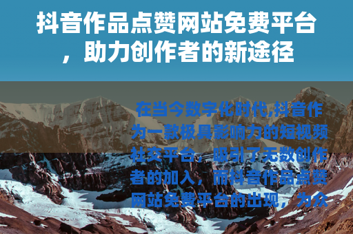 在当今数字化时代,抖音作为一款极具影响力的短视频社交平台,吸引了无数创作者的加入,而抖音作品点赞网站免费平台的出现,为众多创作者提供了一个新的发展契机。