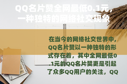 在当今的网络社交世界中,QQ名片赞以一种独特的形式存在着,其中全网最低0.1元的QQ名片赞更是引起了众多QQ用户的关注,QQ名片赞,原本是QQ用户之间一种简单的互动方式,通过点赞他人的名片来表达对对方的关注和喜爱,而当价格因素介入后,它便有了新的意义和价值。