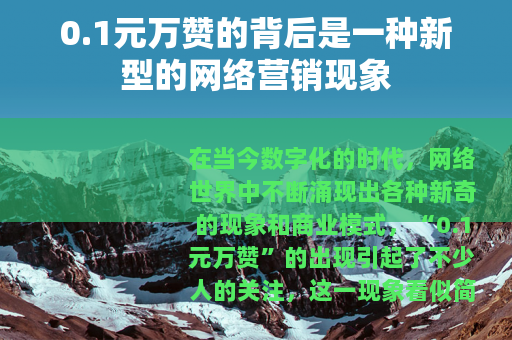 在当今数字化的时代,网络世界中不断涌现出各种新奇的现象和商业模式。“0.1元万赞”的出现引起了不少人的关注,这一现象看似简单,却蕴含着丰富的内涵和潜在的影响。