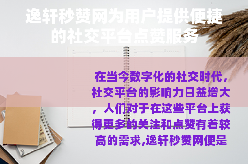 在当今数字化的社交时代,社交平台的影响力日益增大,人们对于在这些平台上获得更多的关注和点赞有着较高的需求,逸轩秒赞网便是在这样的背景下应运而生的一个平台。