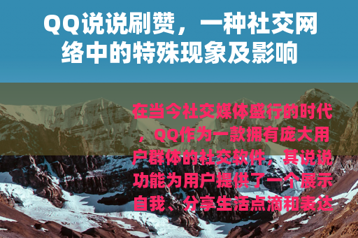在当今社交媒体盛行的时代,QQ作为一款拥有庞大用户群体的社交软件,其说说功能为用户提供了一个展示自我、分享生活点滴和表达情感的平台,而在这个平台上,QQ说说刷赞现象逐渐兴起,成为了一个值得关注的社交网络中的特殊现象。