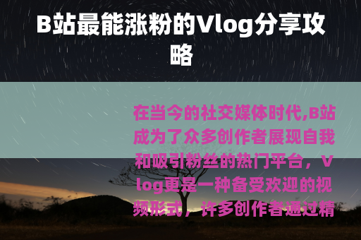 在当今的社交媒体时代,B站成为了众多创作者展现自我和吸引粉丝的热门平台,Vlog更是一种备受欢迎的视频形式,许多创作者通过精彩的Vlog在B站上收获了大量粉丝,如何制作出最能涨粉的Vlog呢?今天就来给大家分享一些实用的经验。 选题至关重要,要选择那些具有吸引力和话题性的主题,比如独特的旅行经历、有趣的生活趣事、热门的美食探索或者是有意义的学习过程等,你可以分享一次小众但风景绝美的旅行目的地,详细介绍当地的风土人情、特色美食以及一些不为人知的小众景点,这样的内容往往能引起观众的好奇心和探索欲,从而吸引更多的关注。