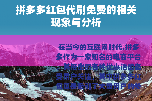 在当今的互联网时代,拼多多作为一家知名的电商平台,其推出的各种优惠活动备受用户关注,其中拼多多红包更是吸引了大量用户的参与,而“拼多多红包代刷免费”这一现象也在一定程度上悄然兴起。
