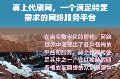 尊上代刷网是一个值得关注和探索的网络服务平台,它在为用户提供服务的过程中不断发展和完善自己,为网络世界的丰富多彩增添了一抹独特的色彩,希望在未来,尊上代刷网能够继续秉持着专业、优质、合法合规的原则,为广大用户提供更好的服务,与用户共同成长,共同创造更加美好的网络未来。