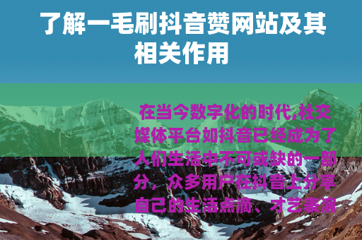 在当今数字化的时代,社交媒体平台如抖音已经成为了人们生活中不可或缺的一部分,众多用户在抖音上分享自己的生活点滴、才艺表演等,希望能够获得更多的关注和点赞,而在这个过程中,一毛刷抖音赞网站也逐渐进入了人们的视野。