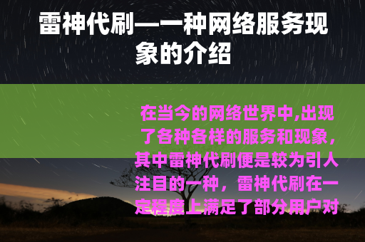 在当今的网络世界中,出现了各种各样的服务和现象,其中雷神代刷便是较为引人注目的一种,雷神代刷在一定程度上满足了部分用户对于特定数据增长或任务完成的需求。