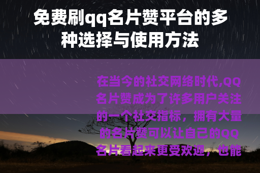 免费刷qq名片赞平台为广大QQ用户提供了一种方便快捷的增加名片赞数量的方式,通过选择合适的平台,并正确使用其服务,用户可以在不花费任何费用的情况下,提升自己QQ名片的受欢迎程度,从而在QQ社交网络中获得更多的关注和乐趣,只要我们在使用过程中保持理性和谨慎,就能充分享受免费刷qq名片赞平台带来的便利和好处。