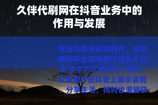 久伴代刷网在抖音业务中扮演着重要的角色,它为用户提供了一种提升账号影响力的途径,在一定程度上满足了市场的需求,但用户在使用其服务时,要结合自身实际情况,合理利用,以实现自己在抖音平台上的可持续发展,才能在借助久伴代刷网等服务的同时,真正在抖音这个充满活力的平台上收获属于自己的成功和快乐,让自己的抖音之旅更加精彩和有意义。