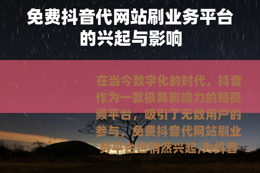 在当今数字化的时代,抖音作为一款极具影响力的短视频平台,吸引了无数用户的参与,免费抖音代网站刷业务平台也悄然兴起,为抖音用户提供了一种看似便捷的提升数据的途径。