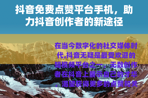 在当今数字化的社交媒体时代,抖音无疑是最受欢迎的短视频平台之一,无数创作者在抖音上展示自己的才华,渴望获得更多的点赞和关注,以提升自己的影响力,而抖音免费点赞平台手机的出现,为这些创作者提供了一个新的助力途径。