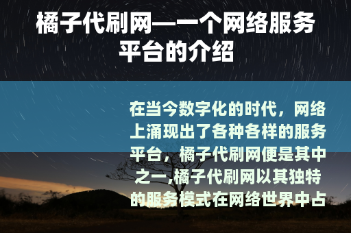 在当今数字化的时代,网络上涌现出了各种各样的服务平台,橘子代刷网便是其中之一,橘子代刷网以其独特的服务模式在网络世界中占据了一席之地。