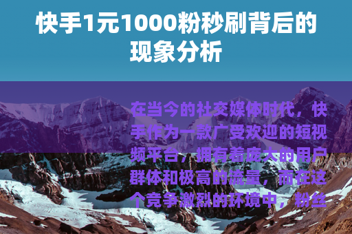 在当今的社交媒体时代,快手作为一款广受欢迎的短视频平台,拥有着庞大的用户群体和极高的流量,而在这个竞争激烈的环境中,粉丝数量往往被视为衡量一个账号影响力和价值的重要指标之一,一种所谓的“快手1元1000粉秒刷”的服务悄然兴起,引发了不少人的关注和讨论。