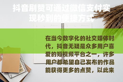 在当今数字化的社交媒体时代,抖音无疑是众多用户喜爱的短视频平台之一,许多用户都希望自己发布的作品能获得更多的点赞,以此来增加作品的热度和曝光度,而现在,有一种方式可以让抖音刷赞通过微信支付实现秒到,为用户带来了极大的便利。