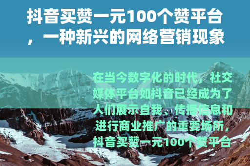 在当今数字化的时代,社交媒体平台如抖音已经成为了人们展示自我、传播信息和进行商业推广的重要场所,抖音买赞一元100个赞平台的出现,引起了广泛的关注和讨论。