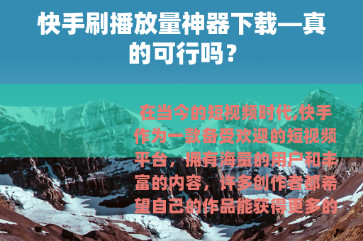 在当今的短视频时代,快手作为一款备受欢迎的短视频平台,拥有海量的用户和丰富的内容,许多创作者都希望自己的作品能获得更多的播放量,从而获得更多的关注和收益,在这种需求下,一些声称是“快手刷播放量神器”的软件开始在网络上出现,吸引了不少人的目光。