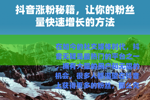 在如今的社交媒体时代,抖音无疑是最热门的平台之一,拥有大量的用户和无限的机会,很多人都渴望在抖音上获得更多的粉丝,那么究竟怎么拍抖音粉丝会多呢?以下是一些实用的方法。 是关键,要确保你的视频内容具有吸引力和独特性,可以从自己的兴趣爱好、专业技能或者生活中的趣事入手,这样你在创作时会更有热情,也更容易展现出真实和个性的一面,如果你擅长烹饪,那就可以拍摄各种美食制作的过程,详细地展示食材的准备、烹饪的步骤以及最终美味菜肴的呈现,让观众在观看的过程中不仅能够学到烹饪技巧,还能感受到美食带来的诱惑。