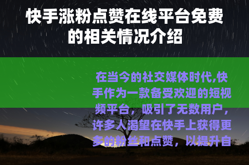 在当今的社交媒体时代,快手作为一款备受欢迎的短视频平台,吸引了无数用户,许多人渴望在快手上获得更多的粉丝和点赞,以提升自己的影响力和作品的热度,而快手涨粉点赞在线平台免费这一现象也随之出现,引发了众多用户的关注。