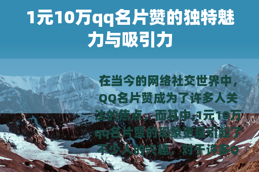 在当今的网络社交世界中,QQ名片赞成为了许多人关注的焦点,而其中,1元10万qq名片赞的现象更是引起了不少人的兴趣。