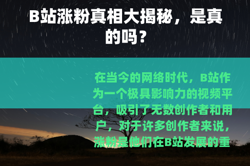 在当今的网络时代,B站作为一个极具影响力的视频平台,吸引了无数创作者和用户,对于许多创作者来说,涨粉是他们在B站发展的重要目标之一,那么B站涨粉是真的吗?这是一个备受关注的问题。