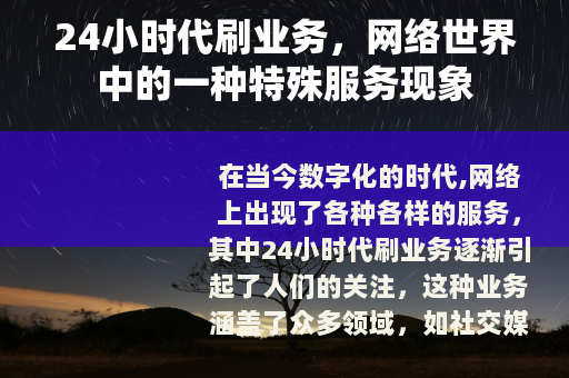 在当今数字化的时代,网络上出现了各种各样的服务,其中24小时代刷业务逐渐引起了人们的关注,这种业务涵盖了众多领域,如社交媒体的点赞、评论、粉丝数量增长,视频平台的播放量提升,以及各类游戏中的虚拟货币获取、等级提升等。