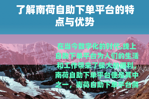 在当今数字化的时代,线上自助下单平台为人们的生活和工作带来了极大的便利,南荷自助下单平台便是其中之一。