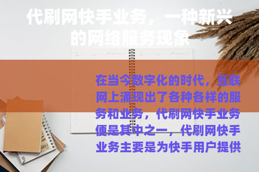 在当今数字化的时代,互联网上涌现出了各种各样的服务和业务,代刷网快手业务便是其中之一,代刷网快手业务主要是为快手用户提供一系列的助力服务,旨在帮助用户在快手上获得更多的关注、点赞、评论以及粉丝数量等。