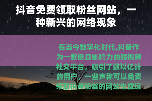 在当今数字化时代,抖音作为一款极具影响力的短视频社交平台,吸引了数以亿计的用户,一些声称可以免费领取抖音粉丝的网站也应运而生,成为了众多抖音创作者关注的焦点。