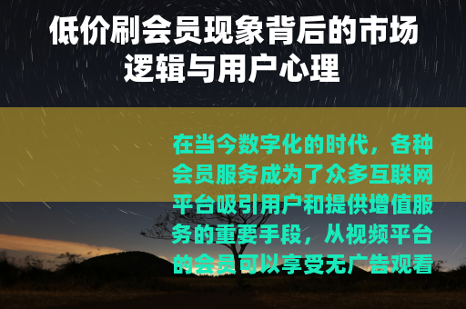 在当今数字化的时代,各种会员服务成为了众多互联网平台吸引用户和提供增值服务的重要手段,从视频平台的会员可以享受无广告观看、独家内容,到电商平台的会员能获得更多的折扣和优质服务,会员权益的丰富性使得越来越多的用户愿意为其付费,与此同时,一种低价刷会员的现象也悄然兴起,在一些网络角落中形成了独特的市场生态。