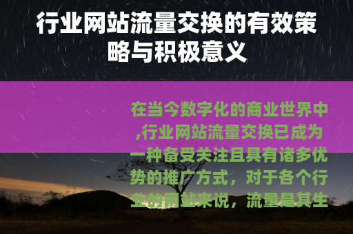在当今数字化的商业世界中,行业网站流量交换已成为一种备受关注且具有诸多优势的推广方式,对于各个行业的网站来说,流量是其生存和发展的关键要素之一,而流量交换则为网站获取更多曝光和用户提供了一条新的途径。