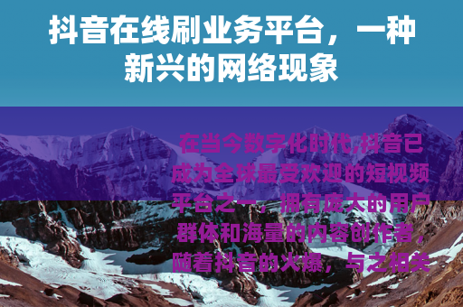 在当今数字化时代,抖音已成为全球最受欢迎的短视频平台之一,拥有庞大的用户群体和海量的内容创作者,随着抖音的火爆,与之相关的各种业务也应运而生,其中抖音在线刷业务平台就是一个备受关注的领域。