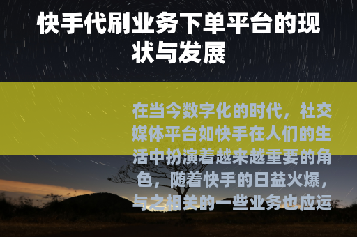 在当今数字化的时代,社交媒体平台如快手在人们的生活中扮演着越来越重要的角色,随着快手的日益火爆,与之相关的一些业务也应运而生,其中快手代刷业务下单平台便是备受关注的一种。