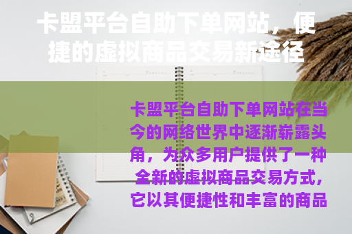 卡盟平台自助下单网站在当今的网络世界中逐渐崭露头角,为众多用户提供了一种全新的虚拟商品交易方式,它以其便捷性和丰富的商品种类吸引着越来越多的人关注和使用。