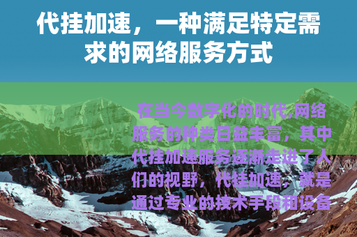 在当今数字化的时代,网络服务的种类日益丰富,其中代挂加速服务逐渐走进了人们的视野,代挂加速,就是通过专业的技术手段和设备,帮助用户在各种网络平台上实现账号的代挂操作,并提升相关业务的运行速度。