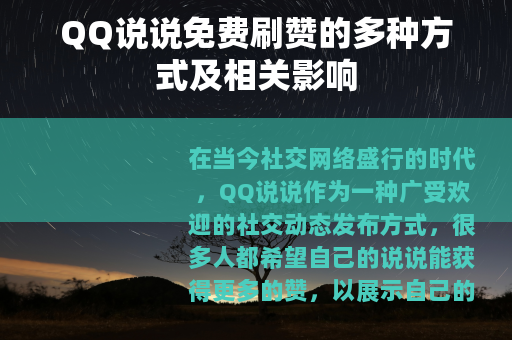 QQ说说免费刷赞的方法有多种,其中一种常见的方式是通过一些特定的软件,这些软件通常在网络上可以找到,它们声称能够帮助用户快速增加QQ说说的赞数,用户只需下载并安装这些软件,按照软件的操作提示进行设置,就有可能实现免费刷赞的效果,一些软件会要求用户输入自己的QQ账号和说说链接,然后通过软件内部的算法和程序,模拟真实用户的点赞行为,从而让说说的赞数不断上升。