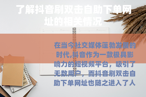 在当今社交媒体蓬勃发展的时代,抖音作为一款极具影响力的短视频平台,吸引了无数用户,而抖音刷双击自助下单网址也随之进入了人们的视野。